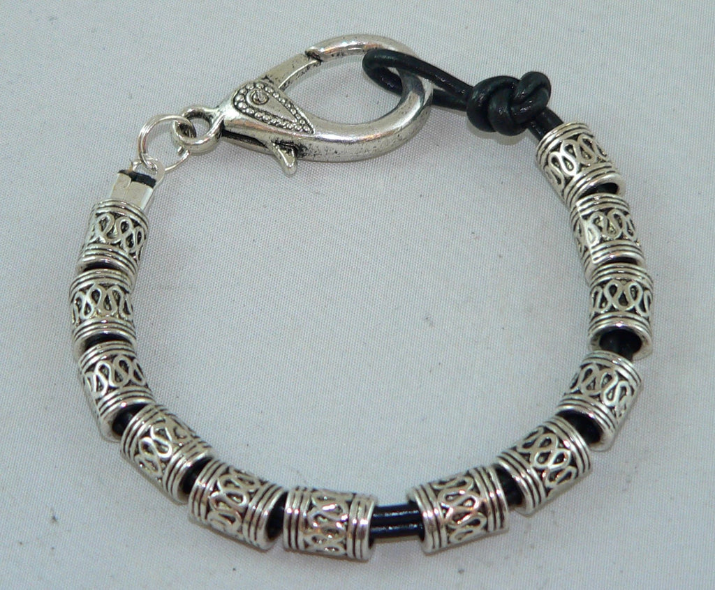 This bracelet has been handcrafted using two strand of genuine black leather, silver Bali beads, and an extra large, decorative lobster claw clasp. The leather is looped on one end and securely knotted. The decorative lobster clasp hooks securely and easily to the leather loop. This is available in lengths between 7" and 9".