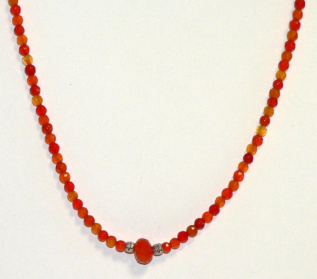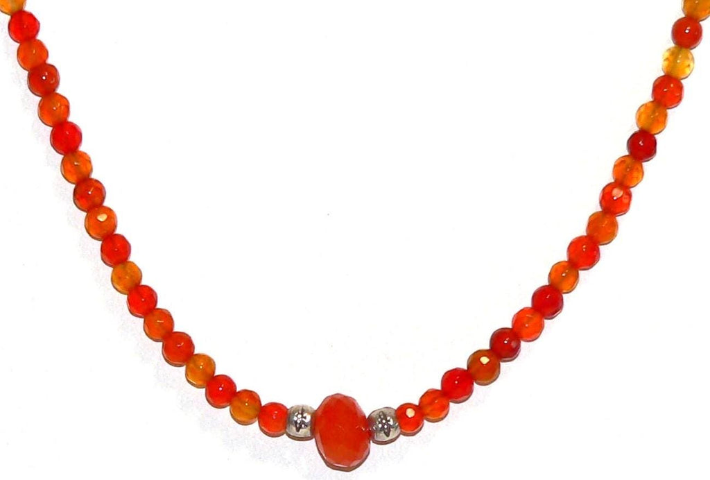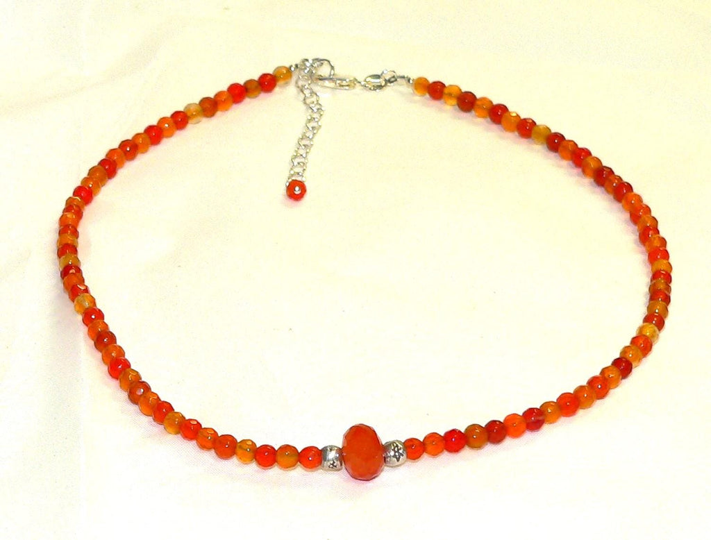 This necklace has been handmade using 4mm carnelian beads, a large, 9mm to 10mm carnelian rondelle bead and Thai silver spacer beads. The necklace has a sterling silver lobster claw clasp and is adjustable between 16" and 18".