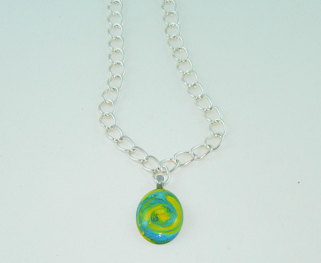 Brilliant Turquoise Yellow Oval Resin Necklace, Unique Swirled Petri Effect, Handmade Statement Jewelry, Psychedelic Colorful Necklace
