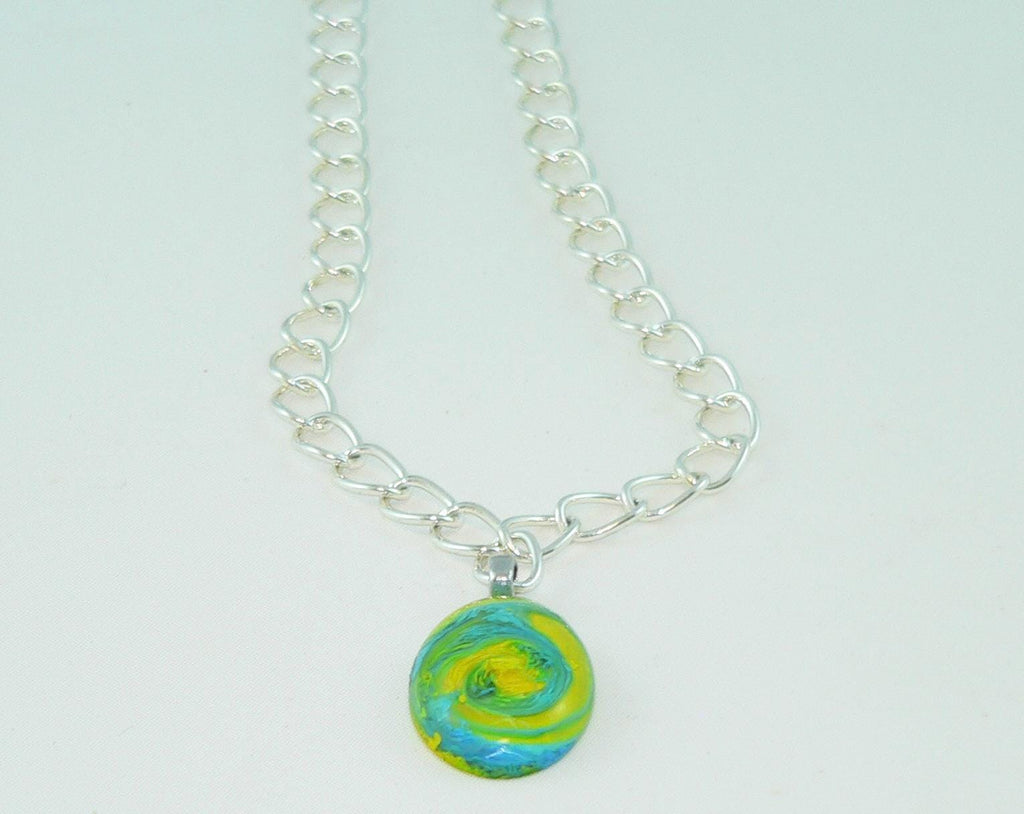 Add a pop of vibrant color to your jewelry collection with this brilliant turquoise and yellow resin necklace featuring a stunning swirled petri effect. Handmade with love, this psychedelic statement necklace is designed to turn heads and spark conversations wherever you wear it. Whether you're dressing up for a special occasion like an anniversary, graduation, or bridesmaid event, or simply adding a bold accessory to elevate your everyday style, this colorful necklace is the perfect choice.