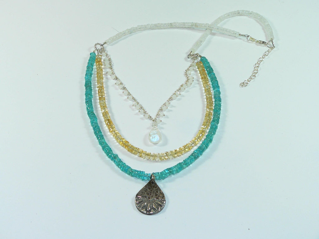 Elevate your style with our exquisite Three Strand Gemstone Necklace, featuring a stunning combination of a silver plated chain with moonstone drop beads and large blue flash moonstone pendant, a strand of 6mm Citrine heishi beads, and a strand of 6mm Apatite heishi beads. The focal point of this necklace is the large, Precious Metal Clay, fine silver, mandala pendant. This beautiful necklace has sterling silver connectors that lead to a single strand of moonstone heishi beads in back of the necklace.