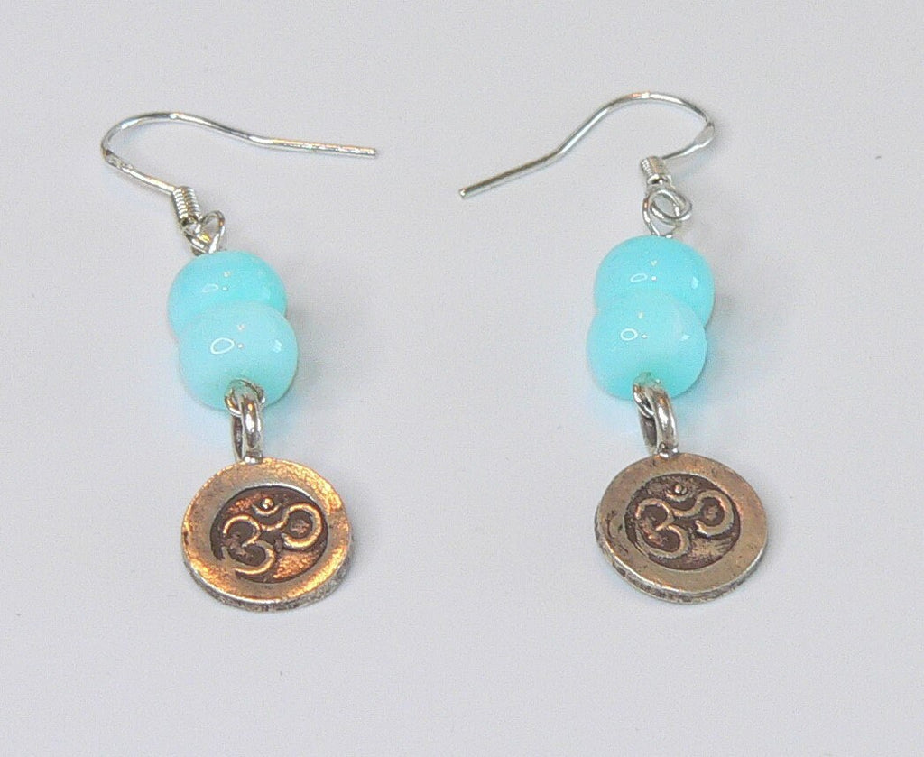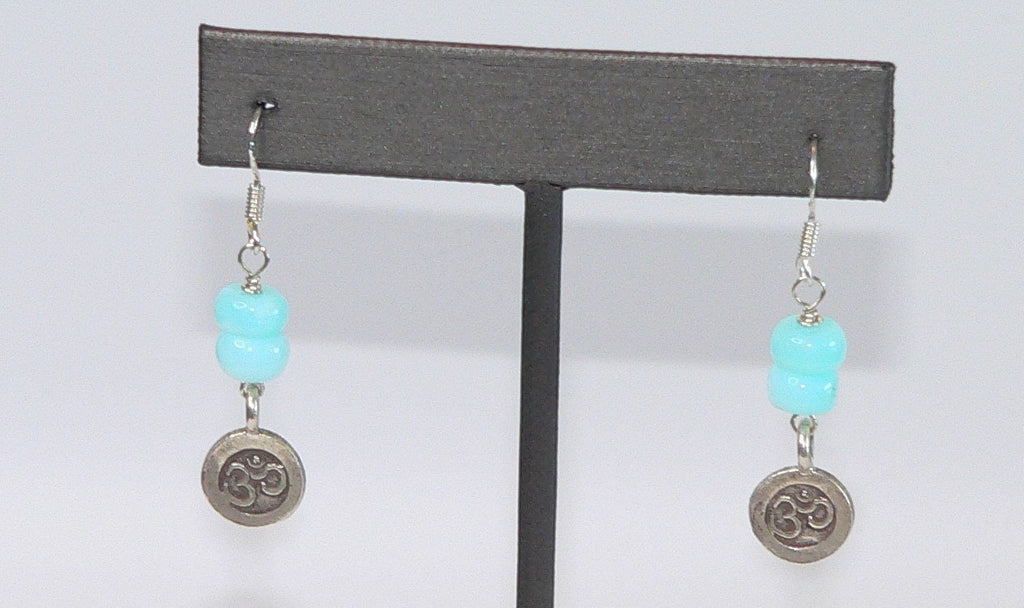 Elevate your style with these exquisite Blue Peruvian Opal Earrings featuring delicate 8mm Hills Tribes/ Thai Silver Om Charms. Crafted with 6mm blue opal and sterling silver ear wires, these earrings measure 1.75 inches long from the top of the ear wires, making them a stunning addition to any outfit. Perfect for adding a touch of elegance to your look, these earrings are sure to become a favorite in your jewelry collection. All metal is either pure Thai Silver or sterling silver.