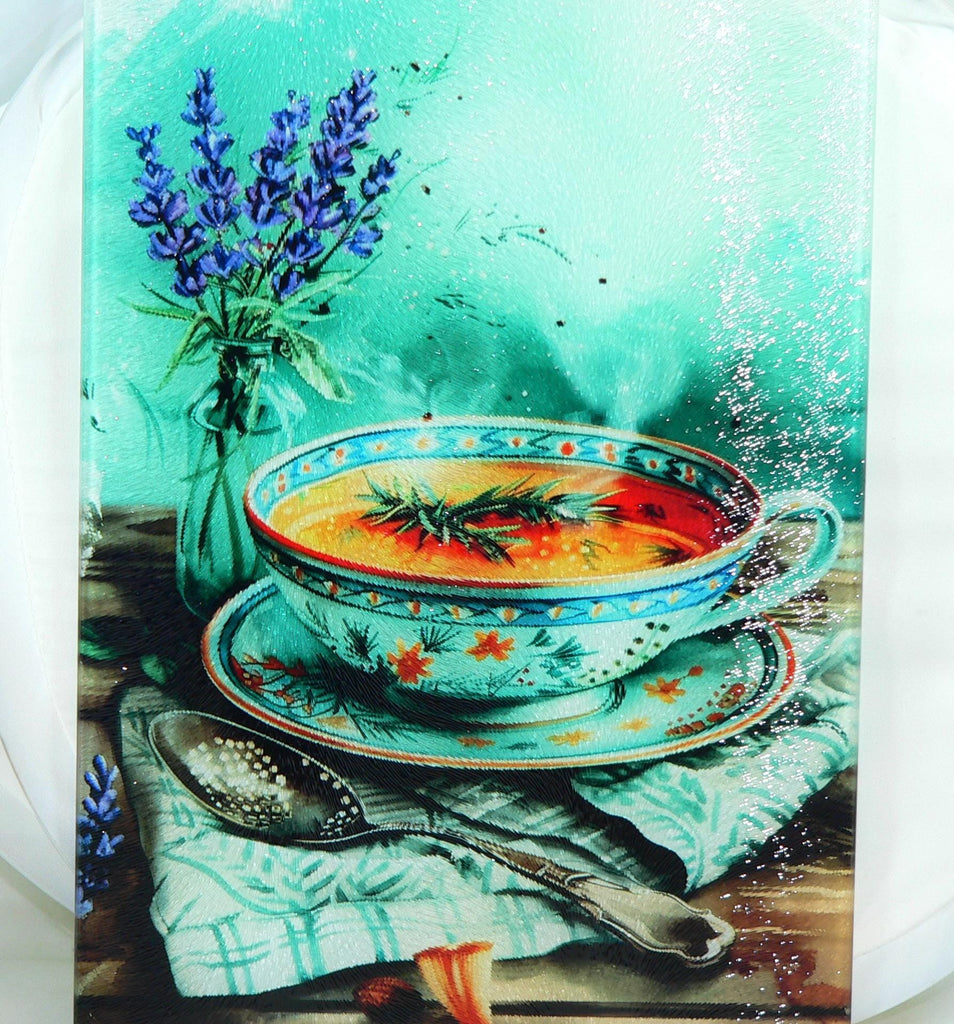 Discover the vibrant beauty of the Culinary Aqua Colored Tempered Glass Cutting Board, a stunning handmade kitchen decor piece that doubles as a versatile serving tray and appetizer platter. Featuring a colorful culinary design, this shatterproof artwork brings a taste of charm to your home, making it perfect for everyday use, special gatherings, or as a decorative accent.