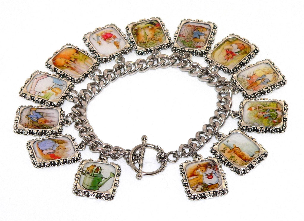 This listing is for 13 charms using images from Beatrix Potter's Peter Rabbit story book. The pictures are set in shiny, silver frames and have been professionally sealed in resin ( Clear Cast Resin is a permanent, waterproof resin that will not yellow or crack). Priority shipping is included in the price.