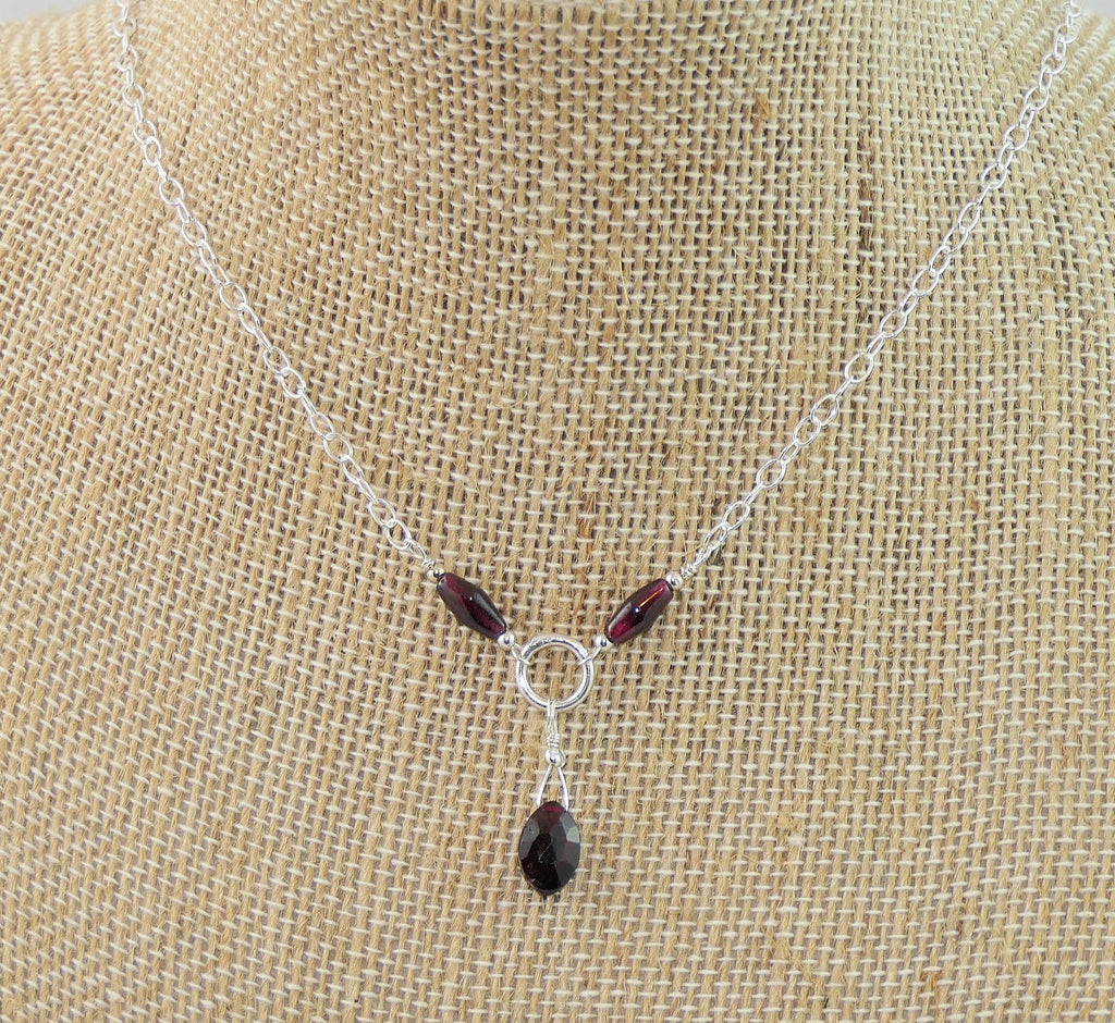 Presenting our handmade garnet necklace, featuring a stunning Y-style design. This necklace showcases a marquis-shaped garnet briolette drop and delicate garnet beads, all elegantly arranged on a sterling silver chain. With a convenient spring clasp, this necklace is available in lengths ranging from 16” to 20”, ensuring a perfect fit for any occasion. Elevate your style with this captivating garnet necklace.