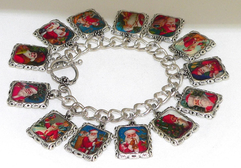 This handcrafted artisan Christmas bracelet is a wonderful piece of women's jewelry. The vintage postcard art used to make these seasonal custom charms make this bracelet a great gift for her. The cute Santa images make this a great bracelet for all your traditional Christmas celebrations. This sentimental piece will be a collectible for years to come