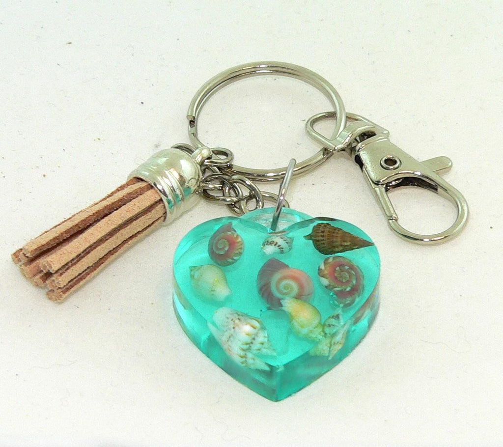 - Materials: Clear resin, real seashells, metal keyring and metal swivel clasp