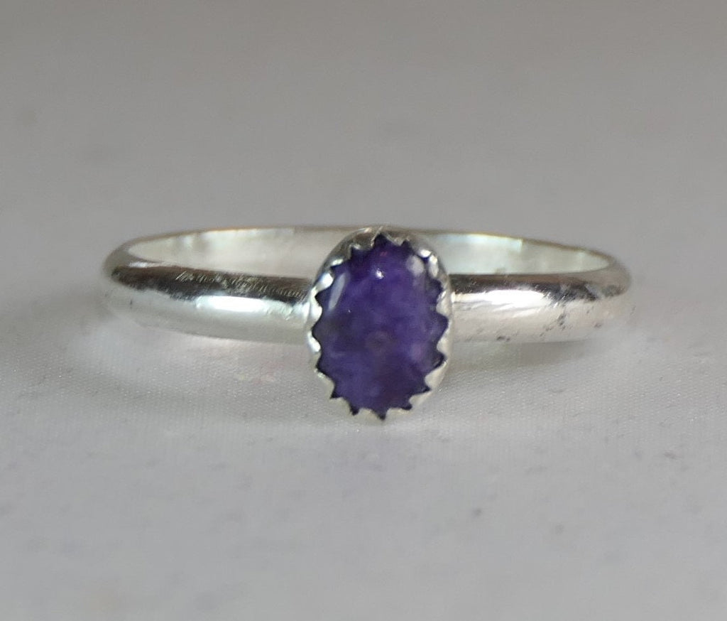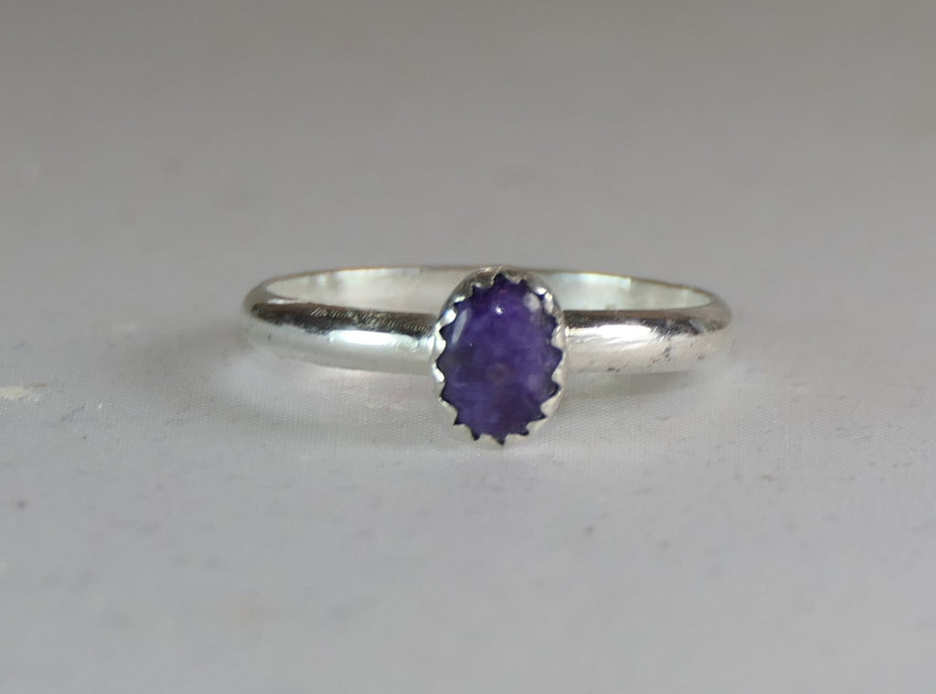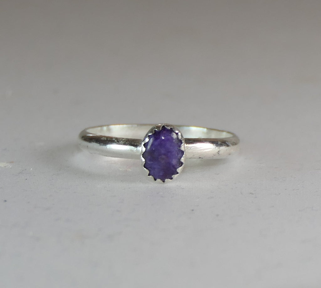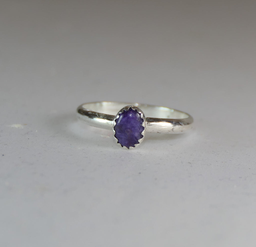 Carefully crafted from high-quality sterling silver, the ring features an oval charoite stone known for its rich, swirling purple hues. The comfortable band is available to fit most finger sizes, ensuring a perfect fit without compromising style. This versatile ring pairs beautifully with other stackable rings and adds a subtle pop of color to any outfit.