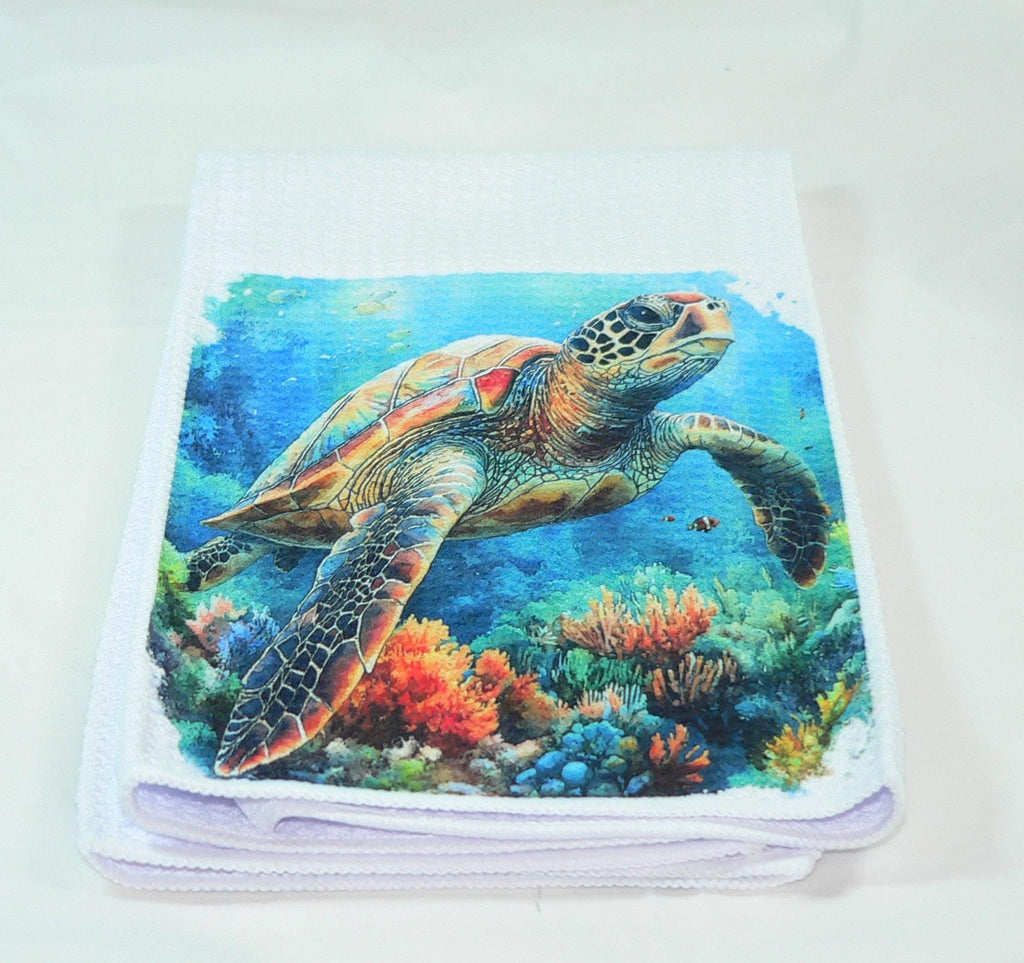 Add a touch of oceanic charm to your kitchen with this Handmade Kitchen Towel Decor featuring a vibrant sea turtle in a stunning ocean theme. Crafted from durable, absorbent fabric, this towel is as practical as it is decorative, making it perfect for everyday use or special beach dedcor. Its colorful design brings a lively, coastal vibe to any space, whether you’re cooking, drying dishes, or just adding a festive touch to your home.