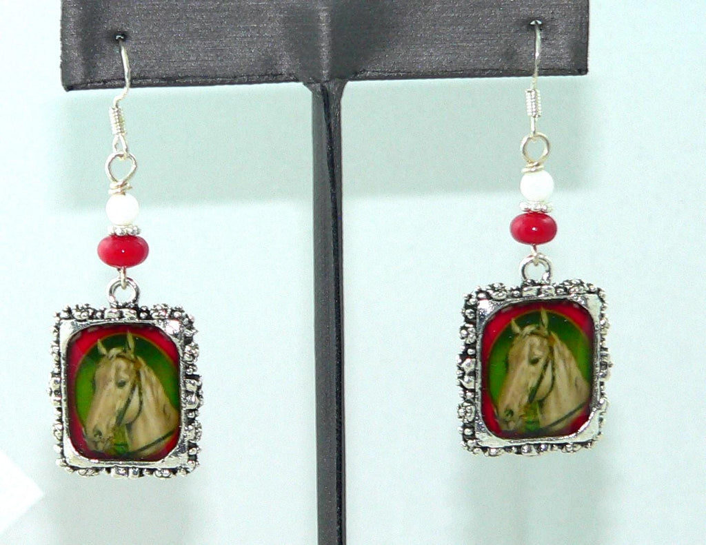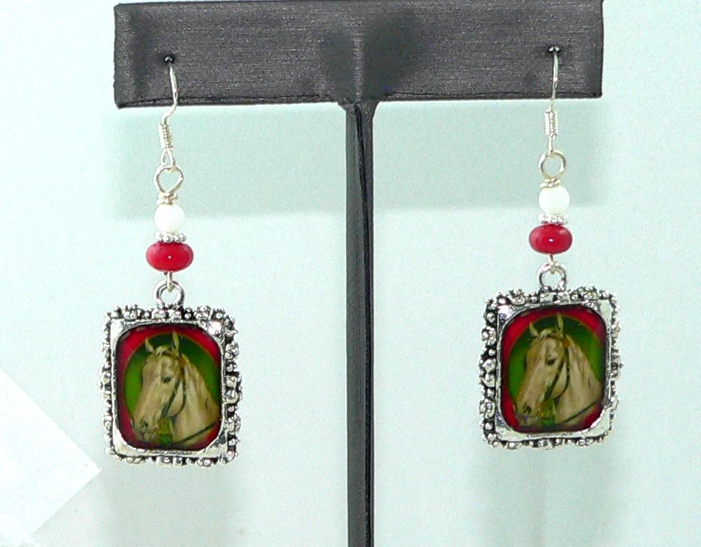 These earrings have been handcrafted using vintage images of prize winning horses. The earrings also have red coral and natural howlite beads. The pictures are set in shiny, silver frames and have been professionally sealed in resin ( Clear Cast Resin is a permanent, waterproof resin that will not yellow or crack with age). The earrings have sterling silver ear wires and hang about 1.5". The images are printed using a high resolution photo printer and are printed on thick, HP Premium Photo Paper.