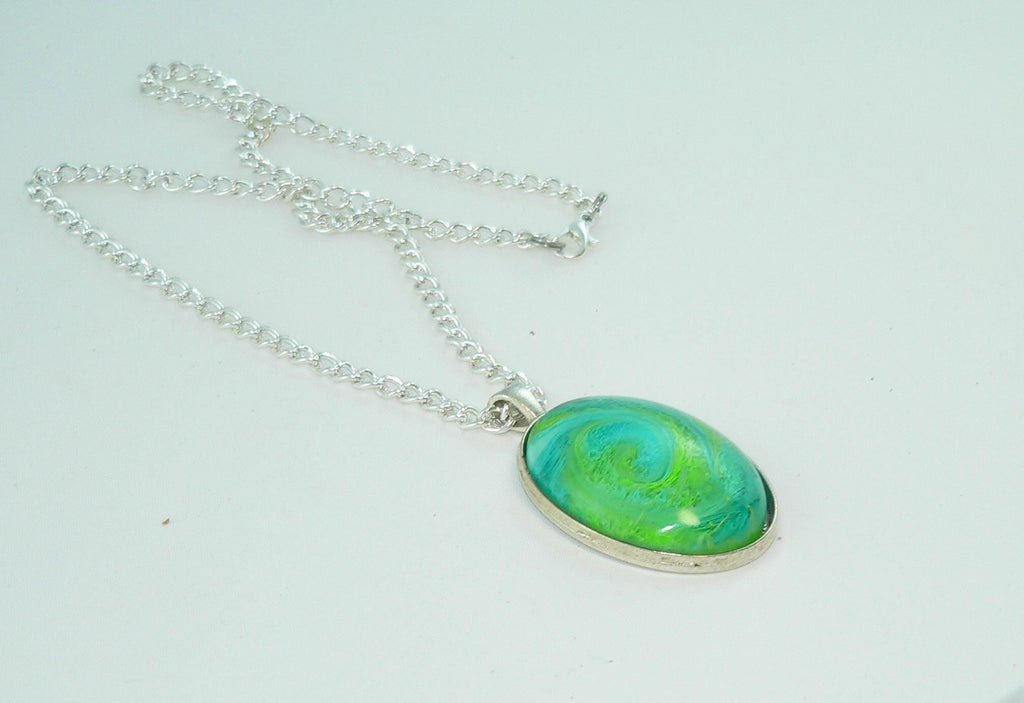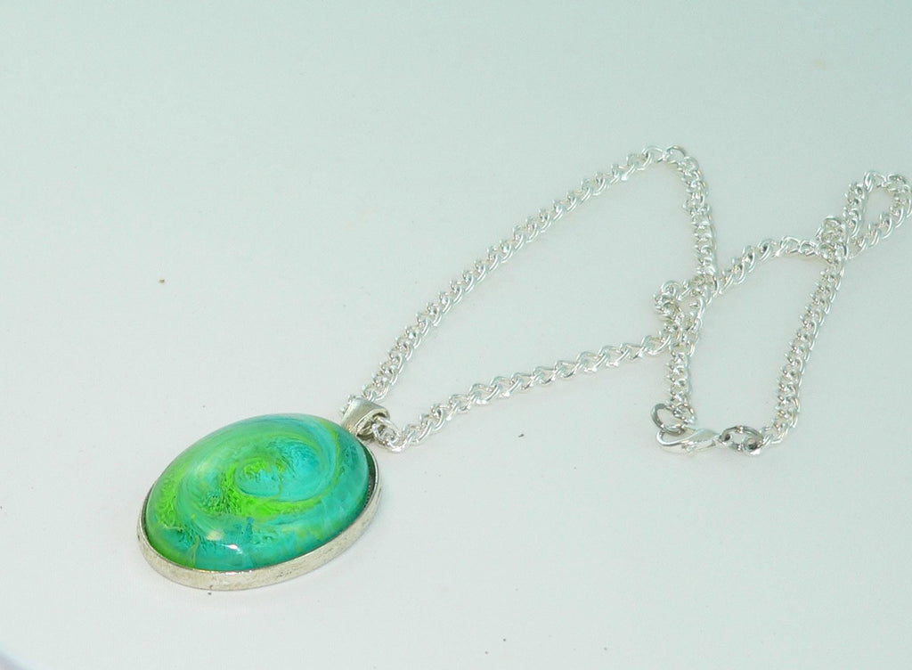 Large Oval Bright Green Turquoise Resin Necklace, Swirled Petri Effect, Handmade Statement Jewelry, Colorful Necklace