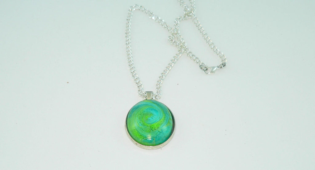 This unique necklace showcases a stunning blend of bright green and turquoise hues, creating a psychedelic effect that captures attention and expresses your bold personality. The handcrafted resin pendant is securely set on a durable chain, making it a versatile accessory suitable for bridesmaids, parties, or as a memorable gift for someone special.