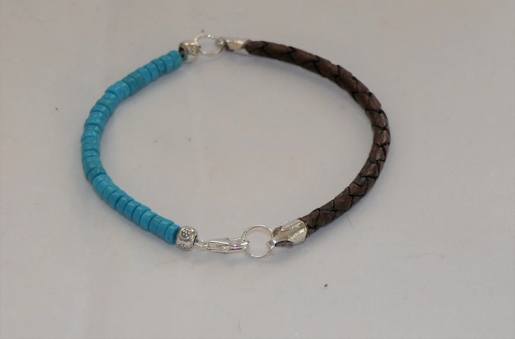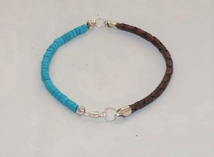 Step into the world of timeless elegance with our Turquoise Leather Bracelet. Handcrafted with genuine 4mm turquoise heishi beads contrasting beautifully with distressed brown braided leather, this piece exudes sophistication and Southwestern charm.