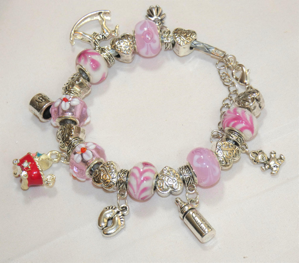 Charms: silver plated girl charm, silver plated rocking horse charm, silver plated cup charm imprinted with baby, red/pink enamel baby buggy charm, silver plated baby feet charm, silver plated bottle charm, silver plated teddy bear charm