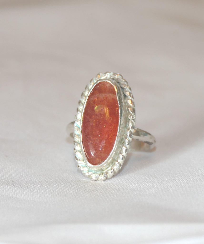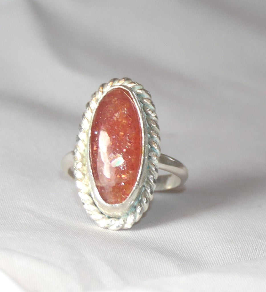 Discover the captivating beauty of this Genuine Sunstone Ring, featuring a stunning oval sunstone measuring 20mm x 10mm set in a sleek sterling silver bezel. Perfect for adding a touch of boho chic to your jewelry collection, this large sunstone ring boasts a warm, fiery orange hue that catches the light beautifully, creating a Sundance style that’s both bold and elegant.