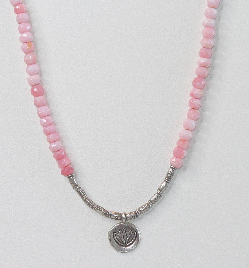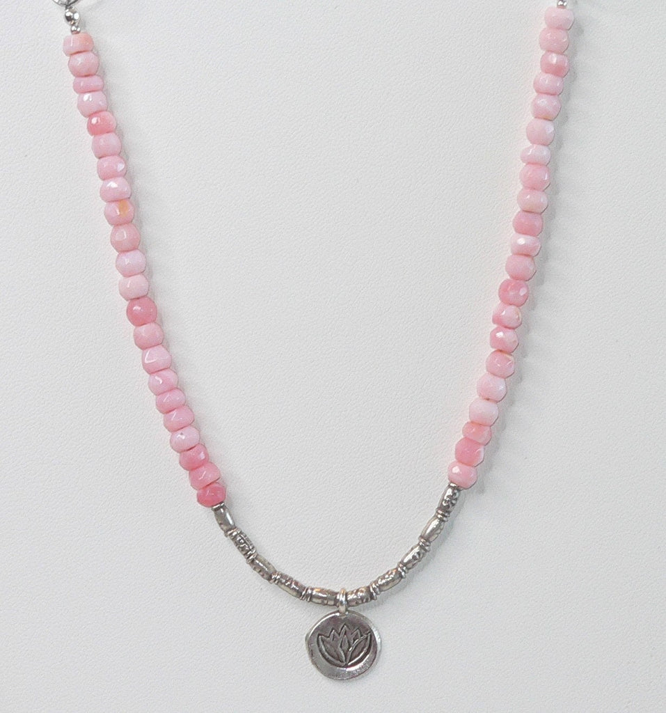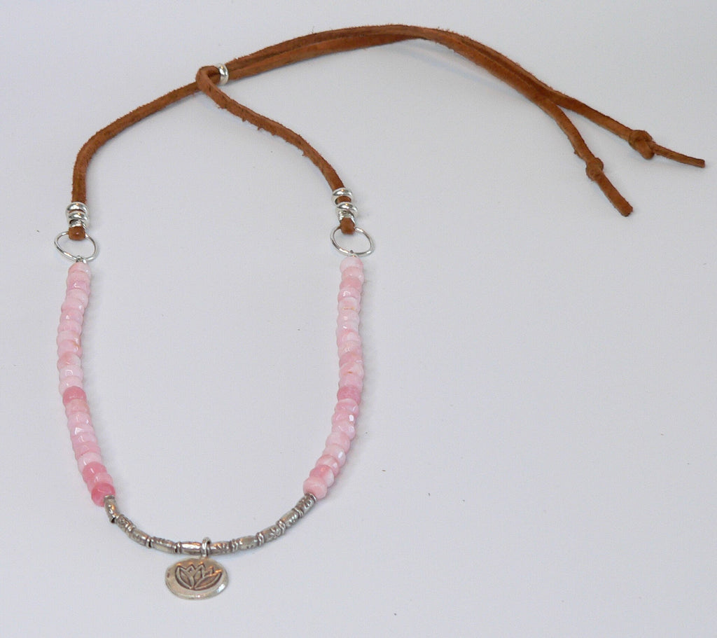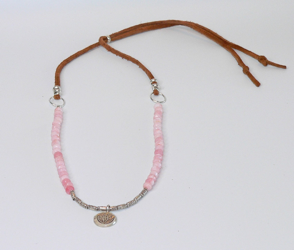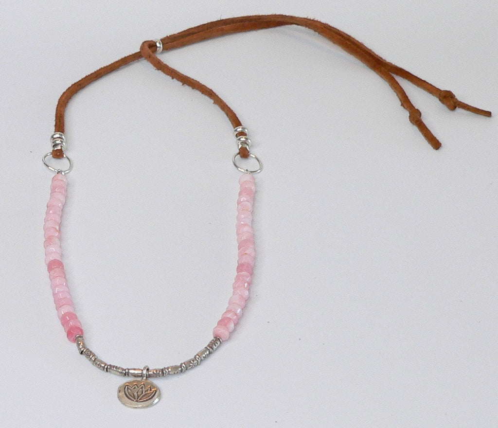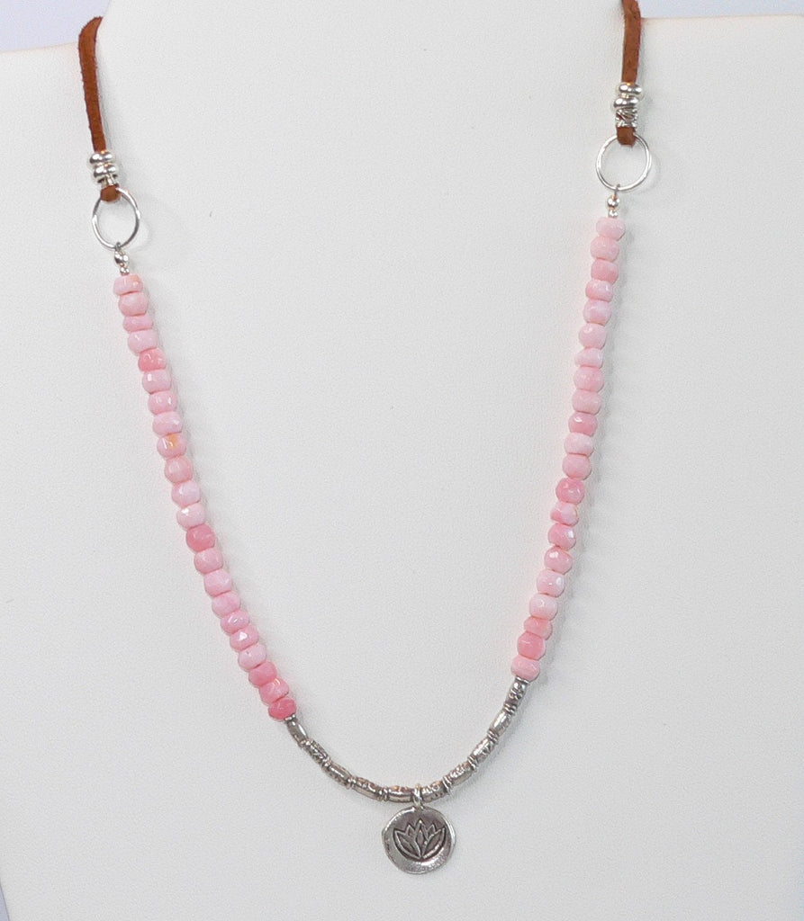 Introducing our exquisite Pink Peruvian Opal Necklace, a stunning piece of jewelry that combines elegance and spirituality.Crafted with care, this necklace features a delicate Thai silver lotus charm, symbolizing purity and enlightenment.The necklace is adorned with Thai Silver printed beads, adding a touch of intricate detail to its design. The 30" soft and subtle deerskin leather adjustable cord ensures a comfortable fit for any wearer, while the slide bead allows for easy adjustment. Whether you're looking for a meaningful gift or a unique addition to your own collection, this Pink Peruvian Opal Necklace is sure to captivate with its beauty and symbolism. Made using 4mm faceted pink opal beads. All sterling silver or fine silver, adjustable up to 30"