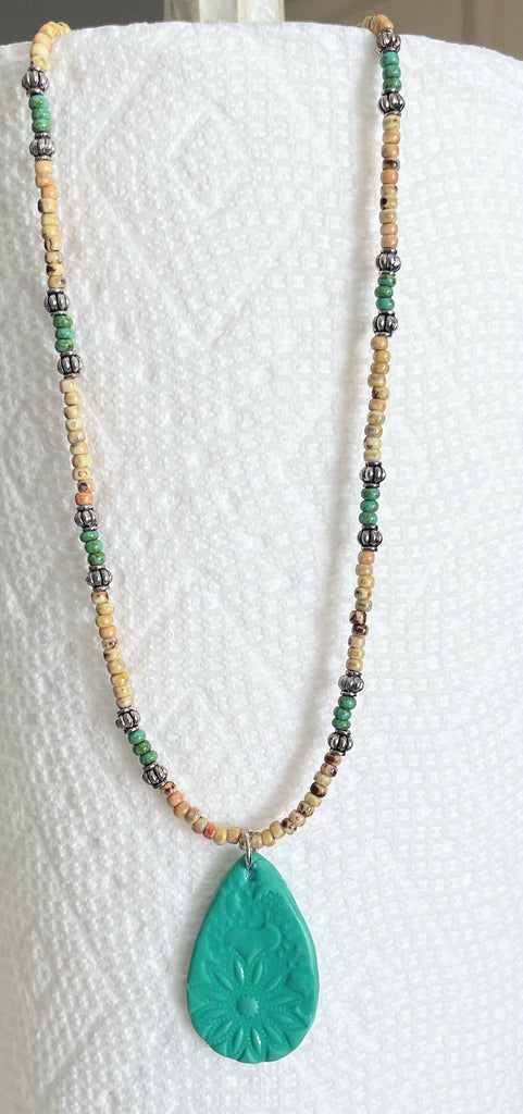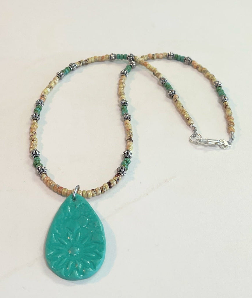 Indulge in the exquisite allure of our Polymer Clay Turquoise Mandala Necklace, featuring a captivating large teardrop mandala pendant suspended delicately from a strand adorned with turquoise, cream, and Bali style beads. Crafted by hand using resilient green turquoise polymer clay embossed with an intricate mandala pattern, this masterpiece measures approximately 1 1/2 inches in length and 3/4 inch in width. Impressively versatile, this necklace is available in adjustable lengths ranging from 15.5 to 18 inches. Immerse yourself in the unparalleled beauty of polymer clay—a lightweight and enduring material baked at around 275° that boasts both flexibility and strength. Revel in the comfort of wearing artisan jewelry known for its durability yet delicate appearance. Own this remarkable piece not only for its striking aesthetics but also for its practicality; perfect to elevate any boho-chic ensemble or as a statement accessory showcasing your unique sense of style. Add this enchanting necklace to your collection today and experience sheer elegance intertwined with unmatched craftsmanship