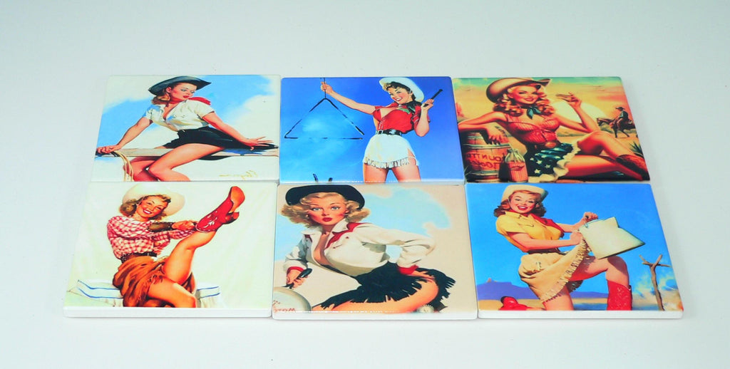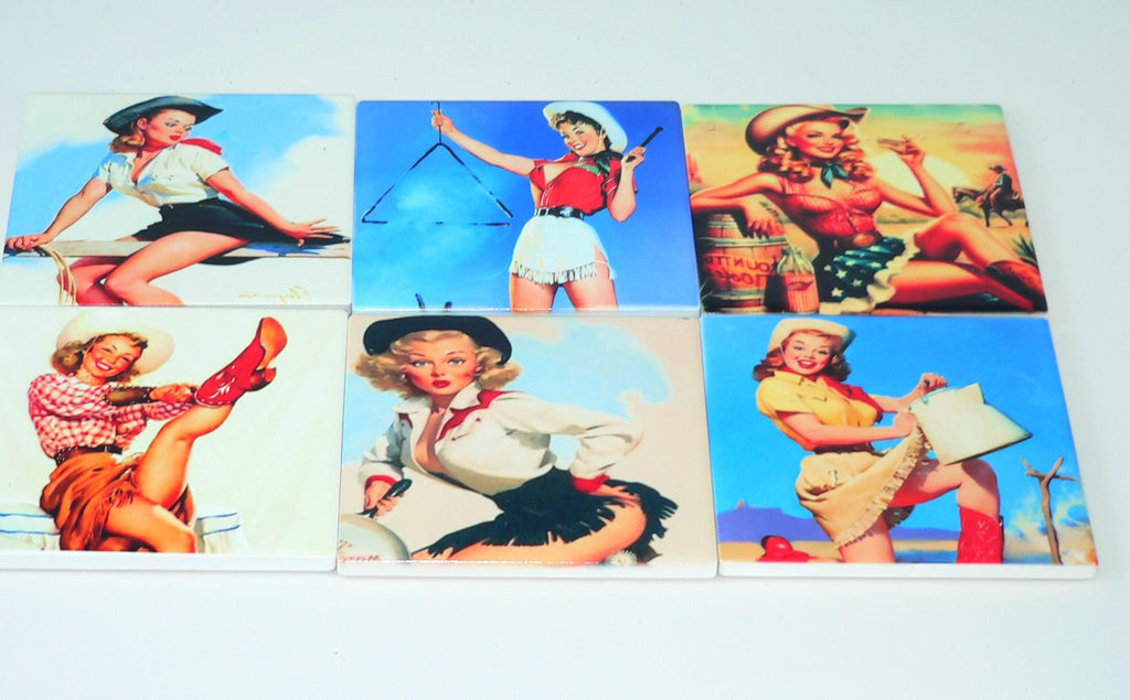 Add a touch of vintage charm to your space with this set of Vintage Cowgirl Pinups Coasters. Perfect for man caves, farmhouse decor, or as a fun housewarming gift, these retro cowgirl pinup coasters combine nostalgic artwork with durable functionality. Featuring colorful, eye-catching designs reminiscent of classic pinup art, each coaster is crafted to be shatterproof and protection resistant, making them ideal for everyday use and entertaining.