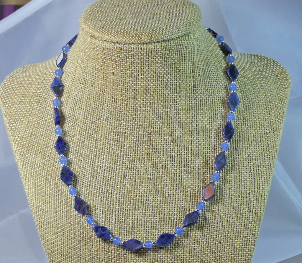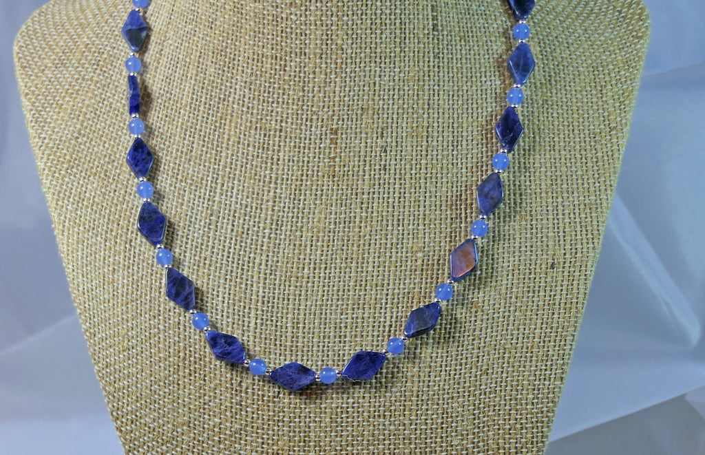 Indulge in the exquisite craftsmanship of our "Sodalite Blue Agate Sterling Silver Necklace," meticulously handcrafted with stunning 6 mm x12mm diamond-shaped sodalite beads, complemented by 4 mm blue agate beads and delicate sterling silver accents. Each necklace features a luxurious sterling silver lobster claw clasp and offers customizable lengths ranging from 15" to 20". Impressively, it is said that sodalite promotes inner peace and harmony while enhancing communication abilities—a unique gem for those seeking balance and self-expression. Picture yourself wearing this versatile piece at Bohemian festival or adding a touch of sophistication to your everyday ensembles; whether making a statement or subtly chic, this necklace will elevate any look effortlessly into an expression of individuality. Complete the ensemble with our matching bracelet and earrings for a harmonious set that exudes elegance through every facet—your ultimate accessory awaits you! Elevate your personal style with the allure of Sodalite Blue Agate Sterling Silver Necklace—it's more than just jewelry, it's an emblem of timeless beauty crafted exclusively for you