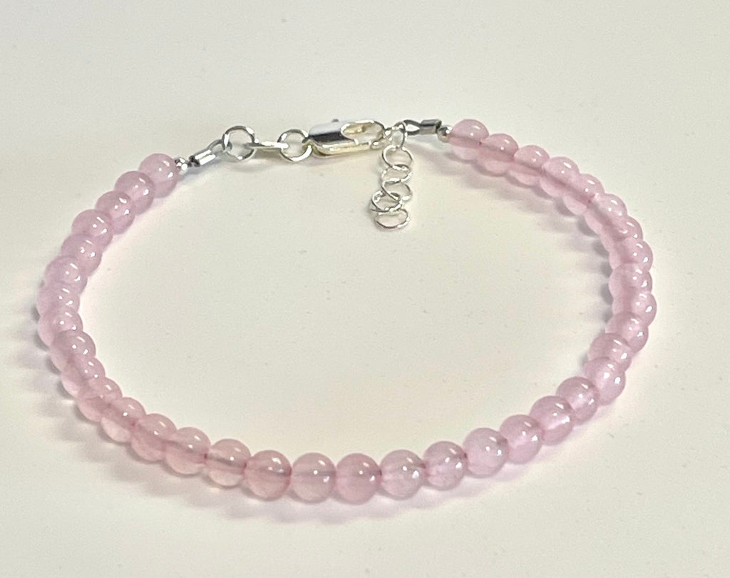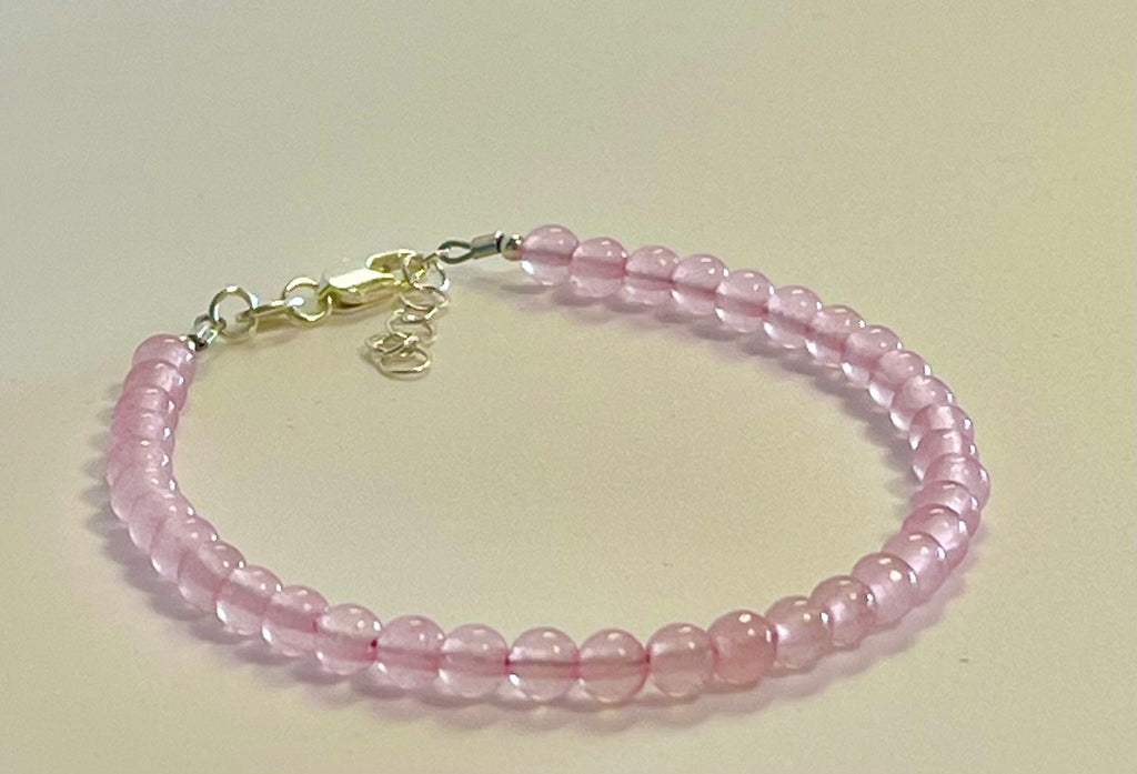 Step into the realm of luxurious elegance with our ethereal Sterling Silver Rose Quartz Beaded Bracelet, a masterpiece that seamlessly blends sophistication with Bohemian allure. Crafted meticulously using exquisite 4mm pink quartz beads and adorned with an adjustable sterling silver lobster claw clasp and chains, this crystal minimalist bracelet is truly a work of art. Envision yourself donning it at a soirée under the stars or presenting it as a token of endearment; its charm knows no bounds and exudes an aura of everlasting grace. Immaculately handcrafted and revered for its love-infused energy, this bracelet is a must have.