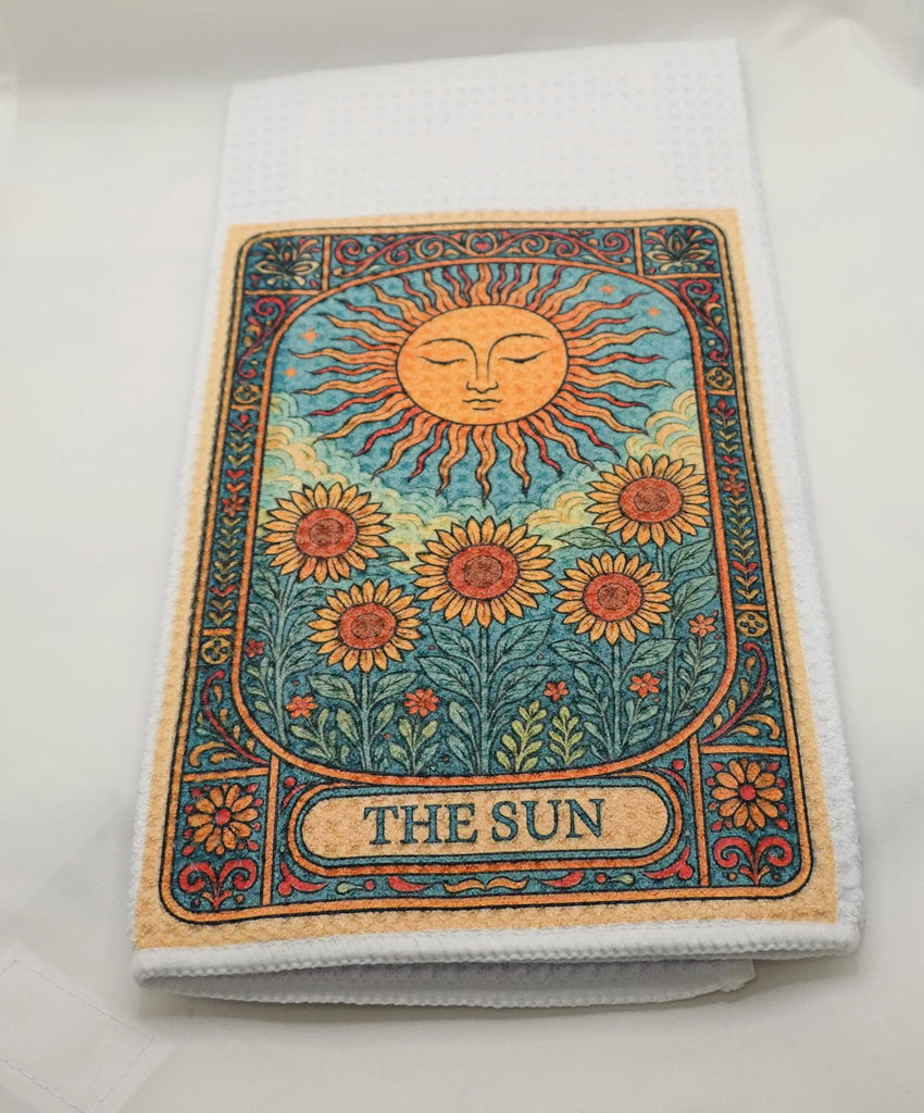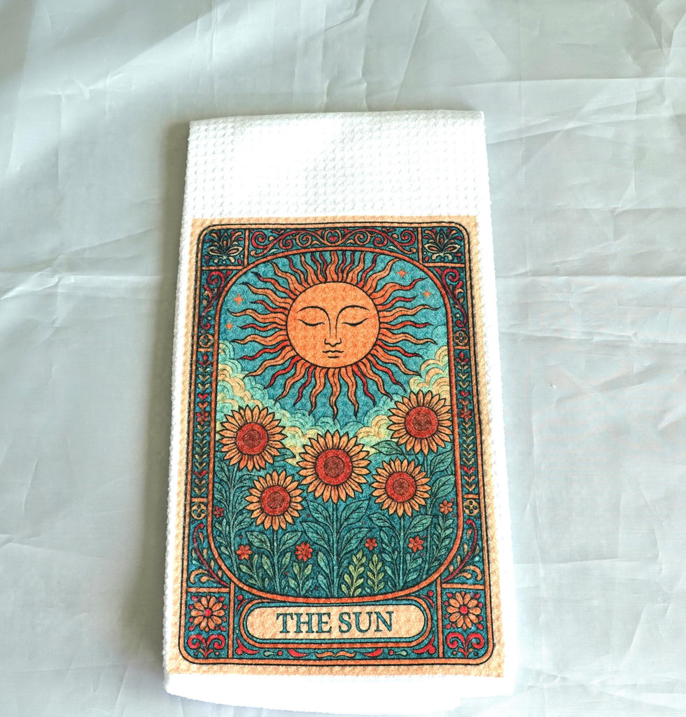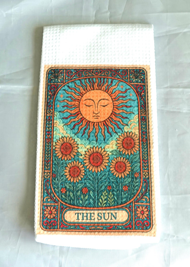 Tarot Card Kitchen Towel Sun and Sunflower Design, Gothic Halloween Dish Towel, Absorbent Fabric Decor, Mystical Autumn Home Accessory