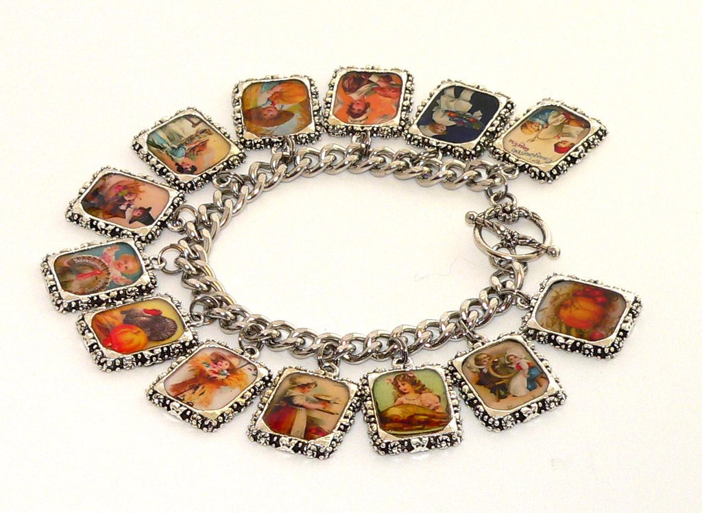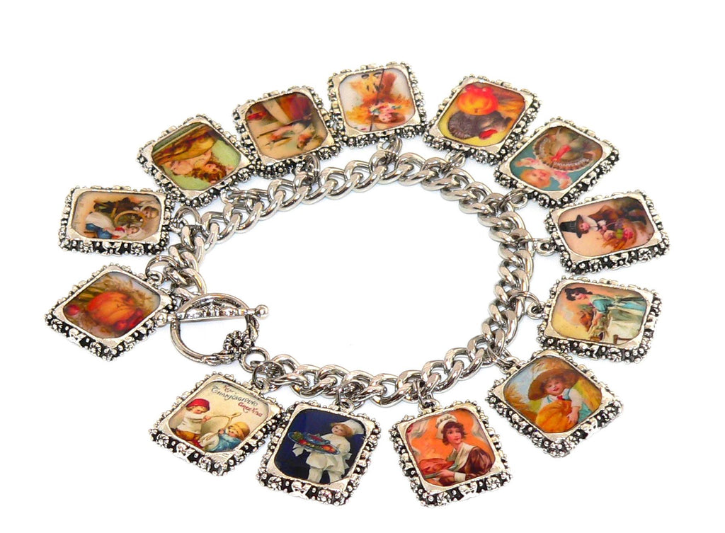 This bracelet has been handcrafted using vintage Thanksgiving images from postcards. The pictures are set in shiny, silver frames and have been professionally sealed in resin ( Clear Cast Resin is a permanent, waterproof resin that will not yellow or crack with age) The bracelet is made with a silver curb style chain and a silver floral toggle clasp. The bracelet is available in lengths between 7" and 9".