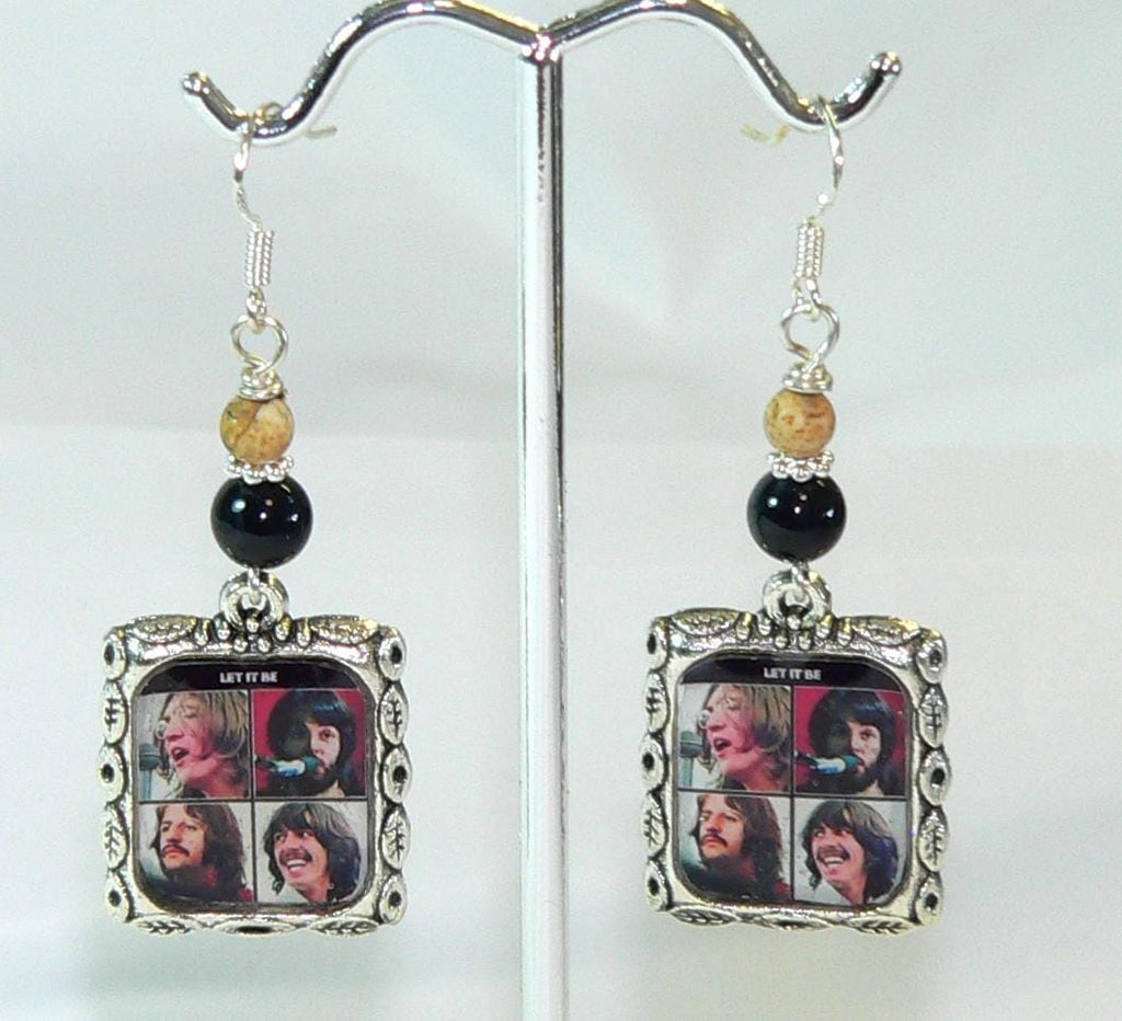 The Beatles Let It Be Earrings, The Beatles Altered Art Earrings with Onyx & Picture Jasper, Unique Beatles Gift for Her,