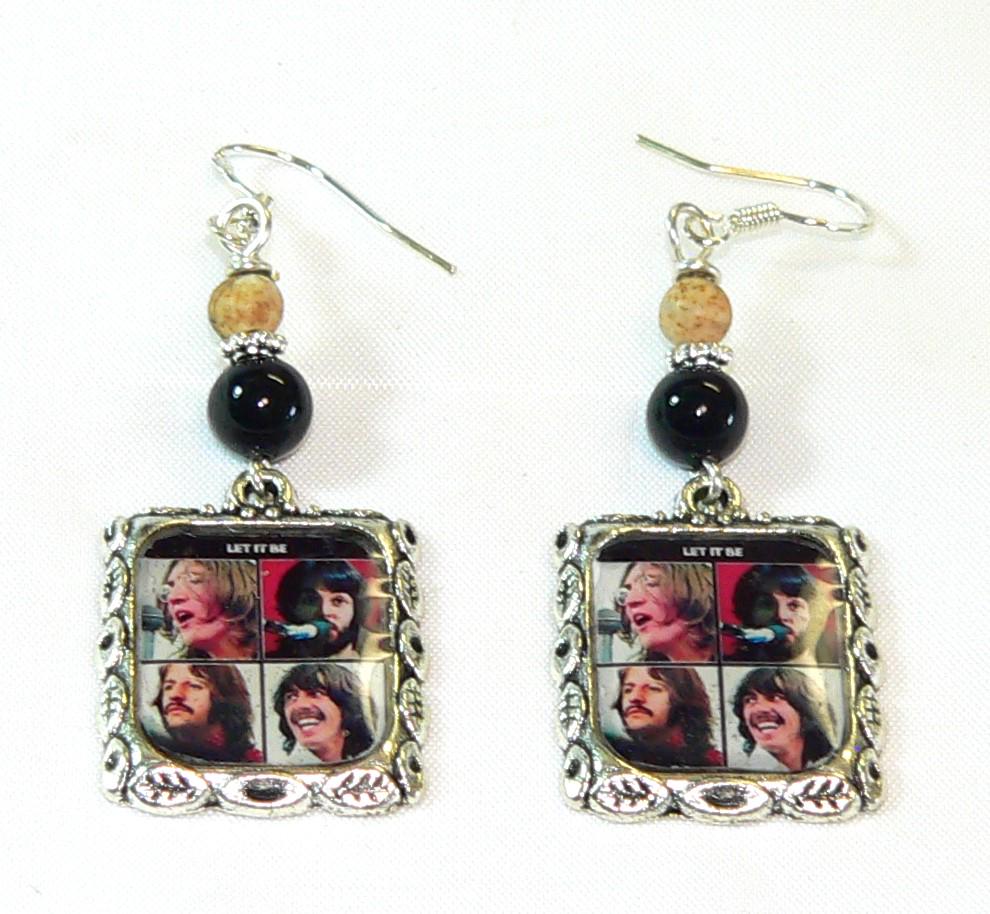 These earrings have been handcrafted using pictures from the from The Beatles Let It Be album and onyx & picture jasper beads. The pictures are set in shiny, silver frames and have been professionally sealed in resin ( Clear Cast Resin is a permanent, waterproof resin that will not yellow or crack with age). The earrings have sterling silver ear wires and hang about 1.5". The images are printed using a high resolution photo printer and are printed on thick, HP Premium Photo Paper.