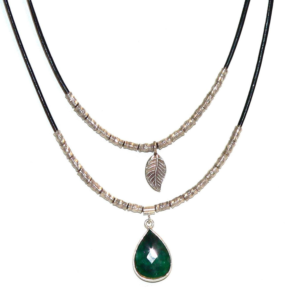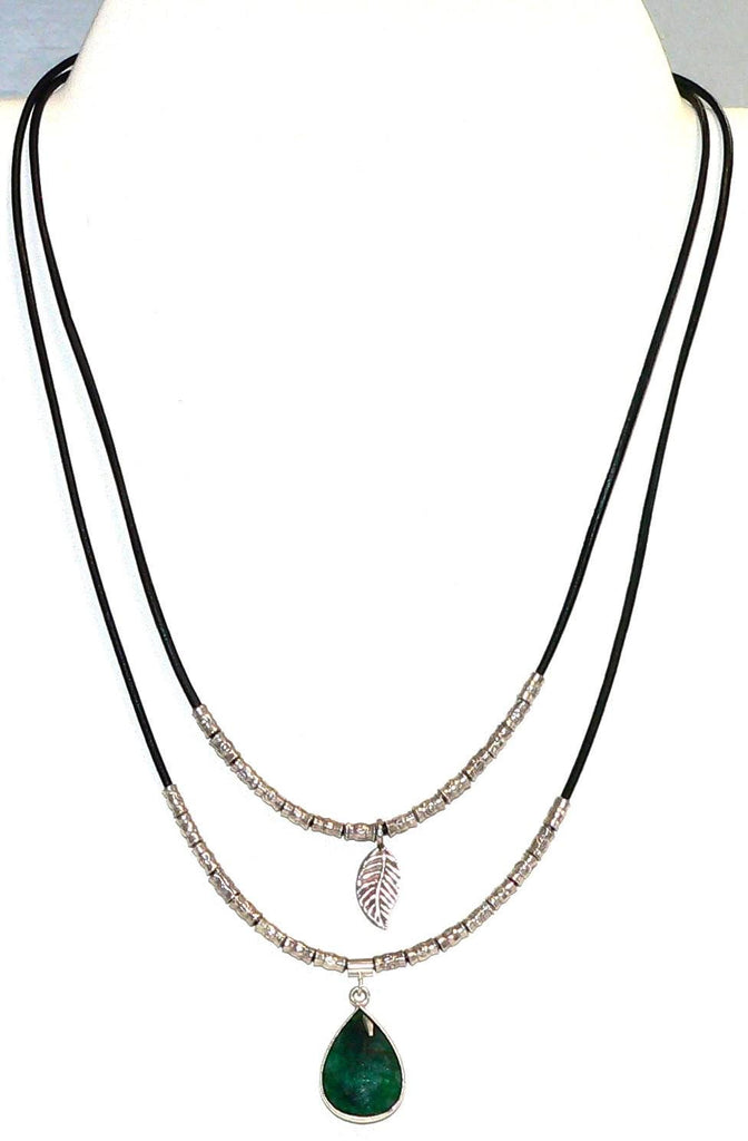 This beautiful necklace features a gorgeous 18mm teardrop emerald pendant. The necklace is made using two strands of genuine leather, Thai silver beads( Hills Tribe silver beads .996% pure silver), and a Thai silver leaf charm. The necklace has a sterling silver lobster claw clasp and is adjustable between 16.5" and 18".