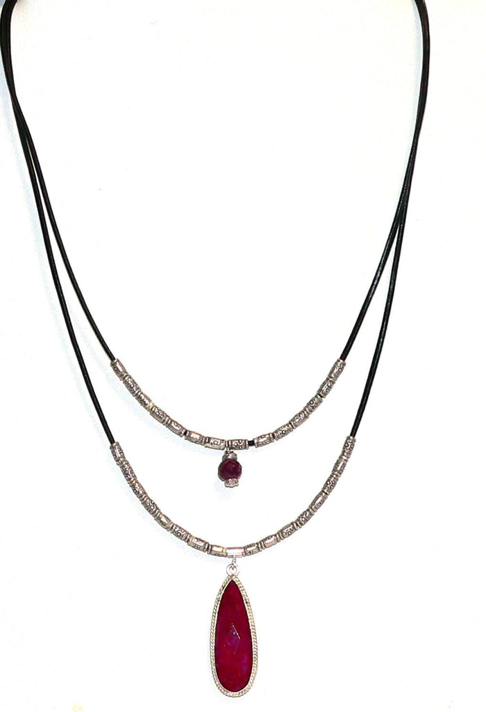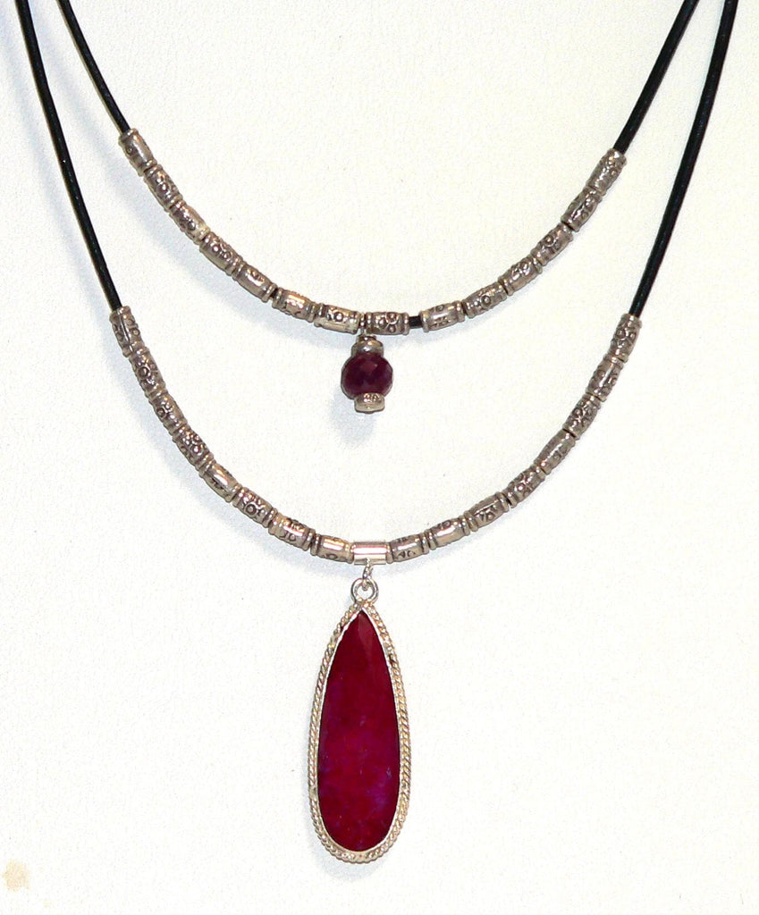 This exquisite necklace features stunning 10mm x 30mm ruby teardrop pendant. The necklace is made using two strands of genuine leather, Thai silver beads( Hills Tribe silver beads .996% pure silver), and an 8mm ruby rondelle bead. The necklace has a sterling silver lobster claw clasp and is adjustable between 17" and 18".