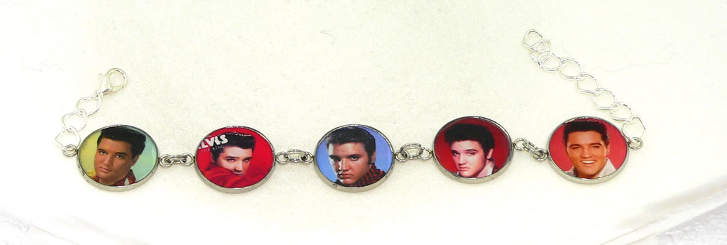 The Elvis Presley bracelet, is a great piece of altered art jewelry for lover's of Elvis The King, the bracelet makes great gifts for anyone who enjoys the music of Elvis, The King. The movie star bracelet is a fun piece of art, for any girlfriend. This handcrafted, artistic bracelet is a statement accessory, that is inspired by Elvis. A festive and fun addition for any Elvis collector,