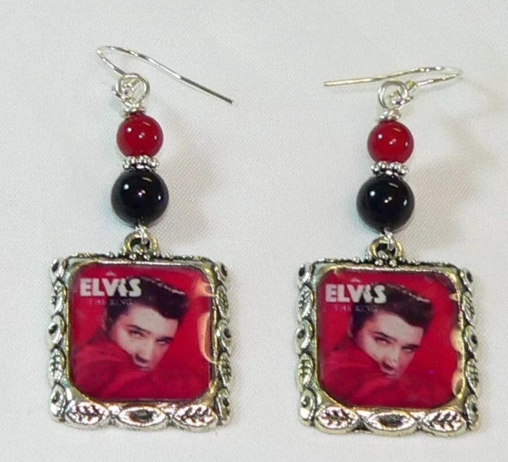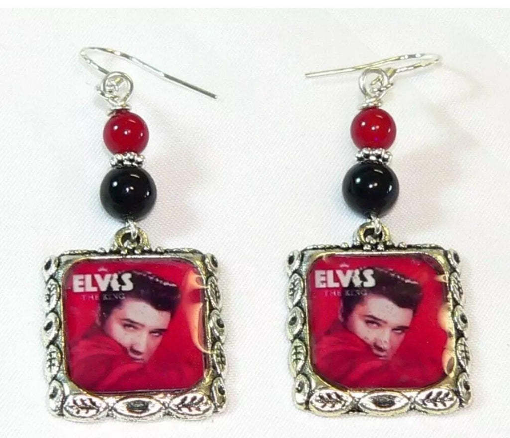 These earrings have been handcrafted using pictures of Elvis Presley. The earrings also have onyx and red jades beads. The pictures are set in shiny, silver frames and have been professionally sealed in resin ( Clear Cast Resin is a permanent, waterproof resin that will not yellow or crack with age). The earrings have sterling silver ear wires and hang about 1.5". The images are printed using a high resolution photo printer and are printed on thick, HP Premium Photo Paper.