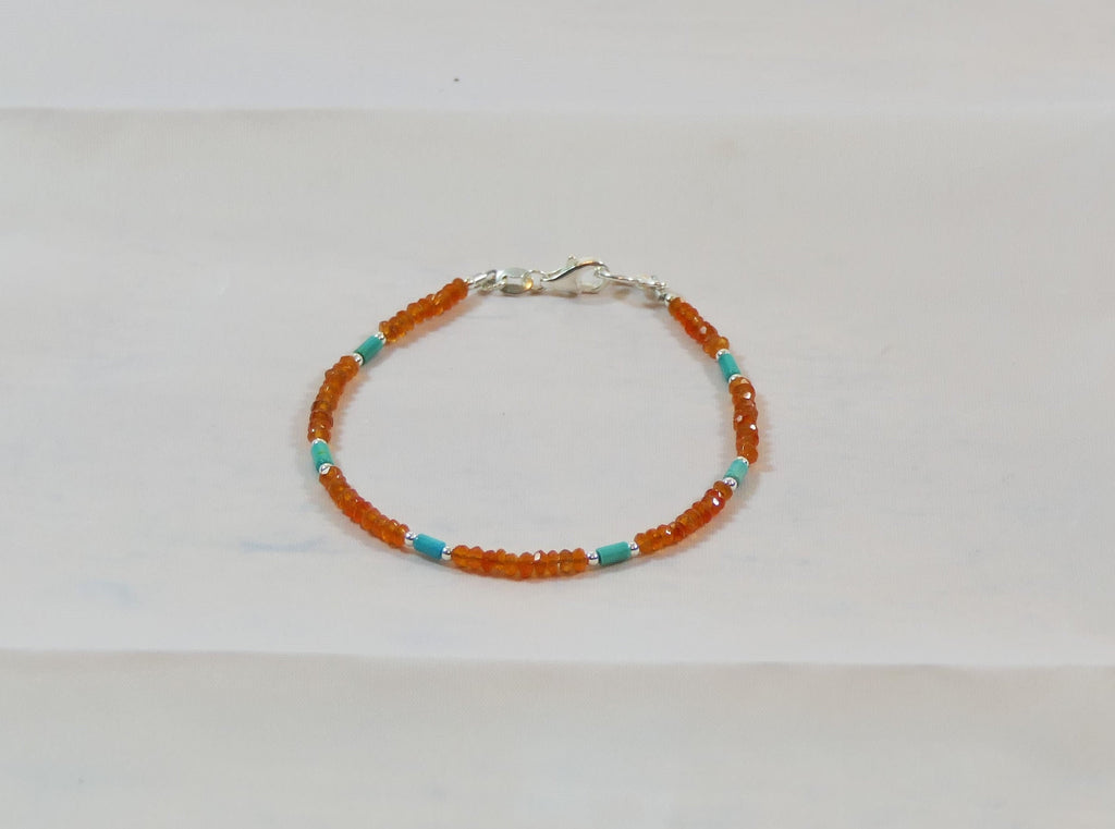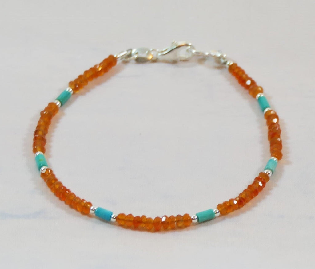 Meticulously adorned with stunning 4 mm carnelian rondelle beads 2mm sterling silver beads and delicate Kingman turquoise tube beads, this bracelet is a