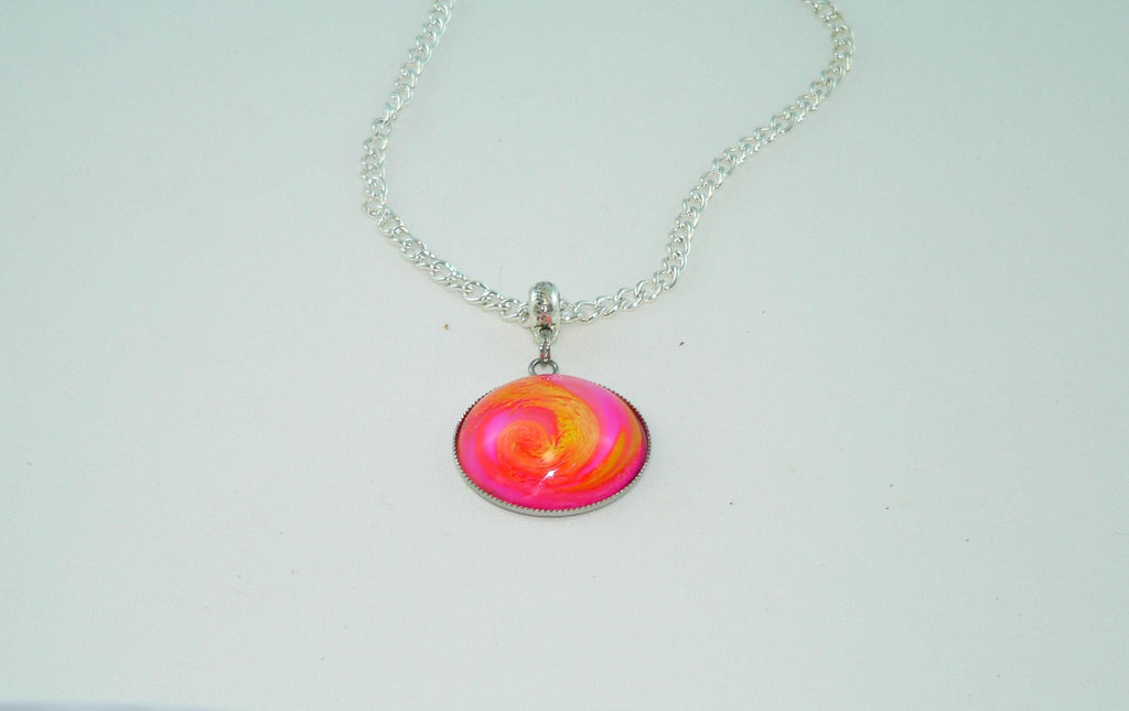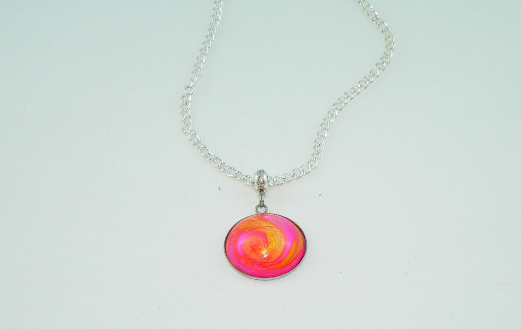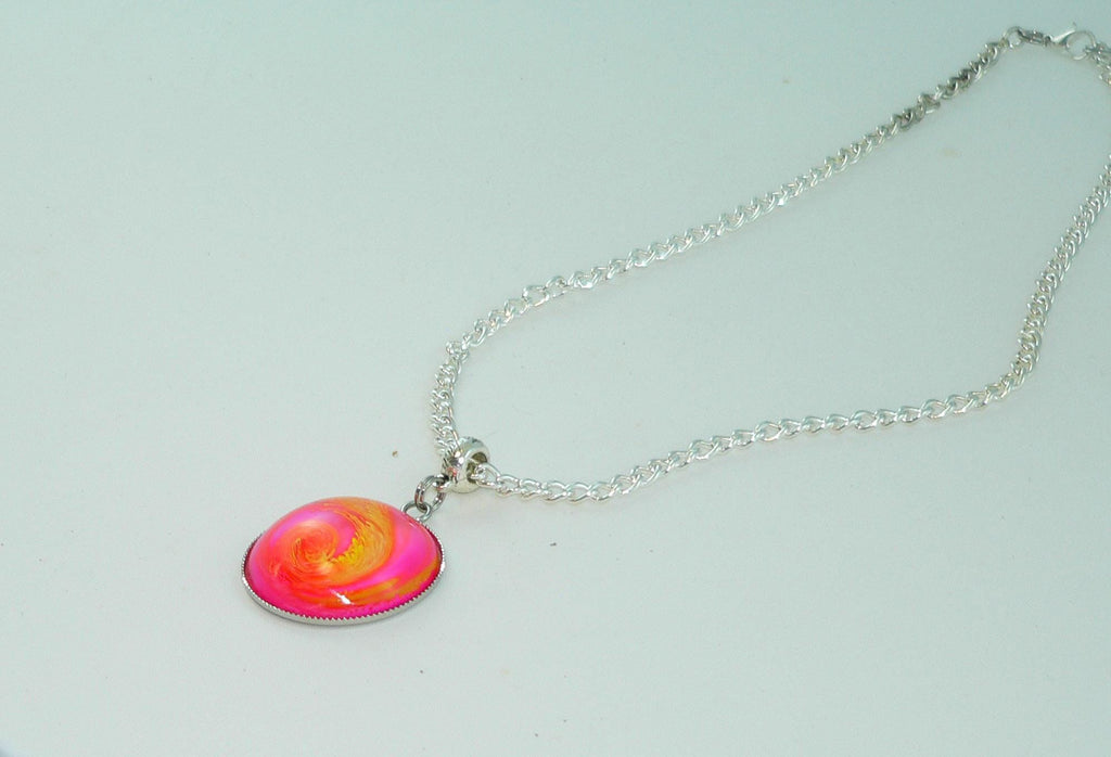 This handmade statement jewelry combines playful hues of flamingo pink, sunny yellow, and swirling orange in a mesmerizing effect that’s both psychedelic and eye-catching. The lightweight resin pendant hangs from a durable, shiny chain, making it comfortable to wear all day or night.