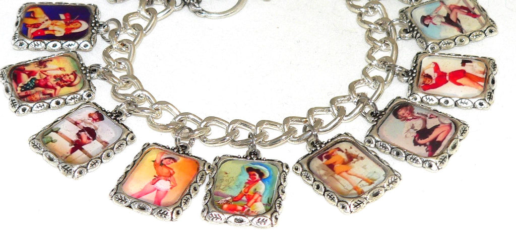 This bracelet has been handcrafted using retro images of Cowgirl Pin Ups. The pictures are set in shiny, silver frames and have been professionally sealed in resin ( Clear Cast Resin is a permanent, waterproof resin that will not yellow or crack with age) The bracelet is made with a silver curb style chain and a silver floral toggle clasp. The bracelet is available in lengths between 7" and 9".