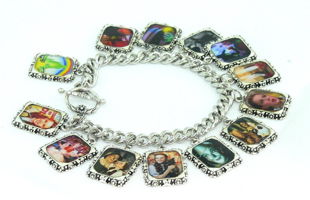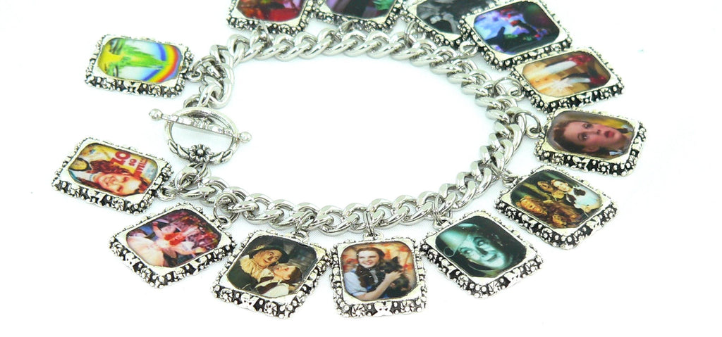 This bracelet has been handcrafted using Wizard of Oz pictures. The pictures are set in shiny, silver frames and have been professionally sealed in resin ( Clear Cast Resin is a permanent, waterproof resin that will not yellow or crack with age) The bracelet is made with a silver curb style chain and a silver floral toggle clasp. The bracelet is available in lengths between 7" and 9".